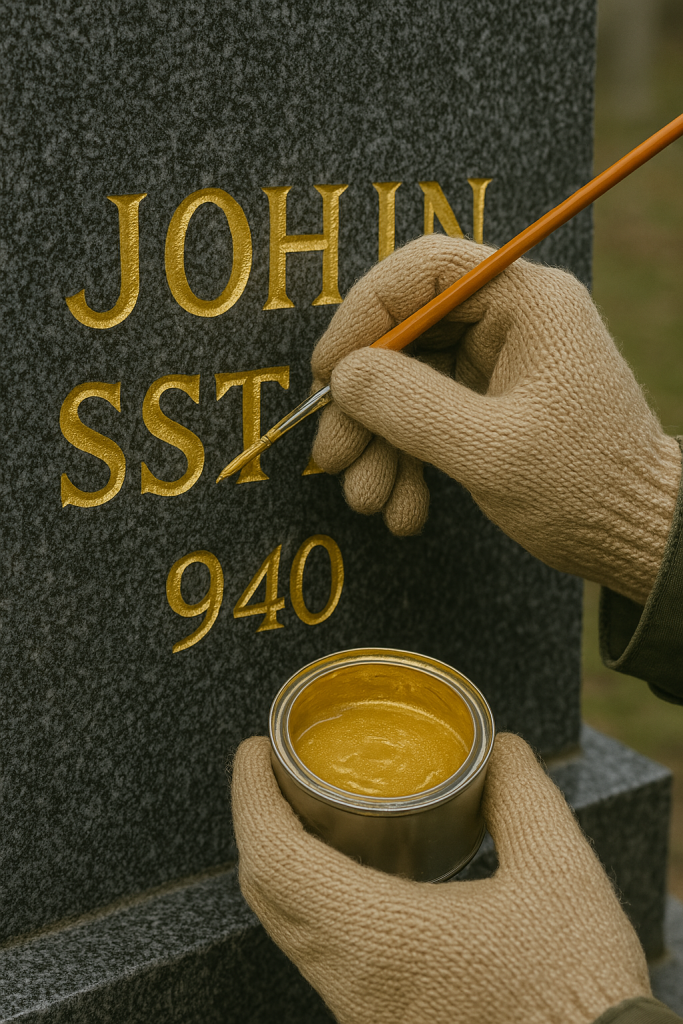 Oczyszczanie, uzupełnianie i odnowienie liter na nagrobkach, które z biegiem czasu mogą ulec zatarciu lub uszkodzeniu. Przywracamy czytelność inskrypcji i dbamy o estetykę napisu.